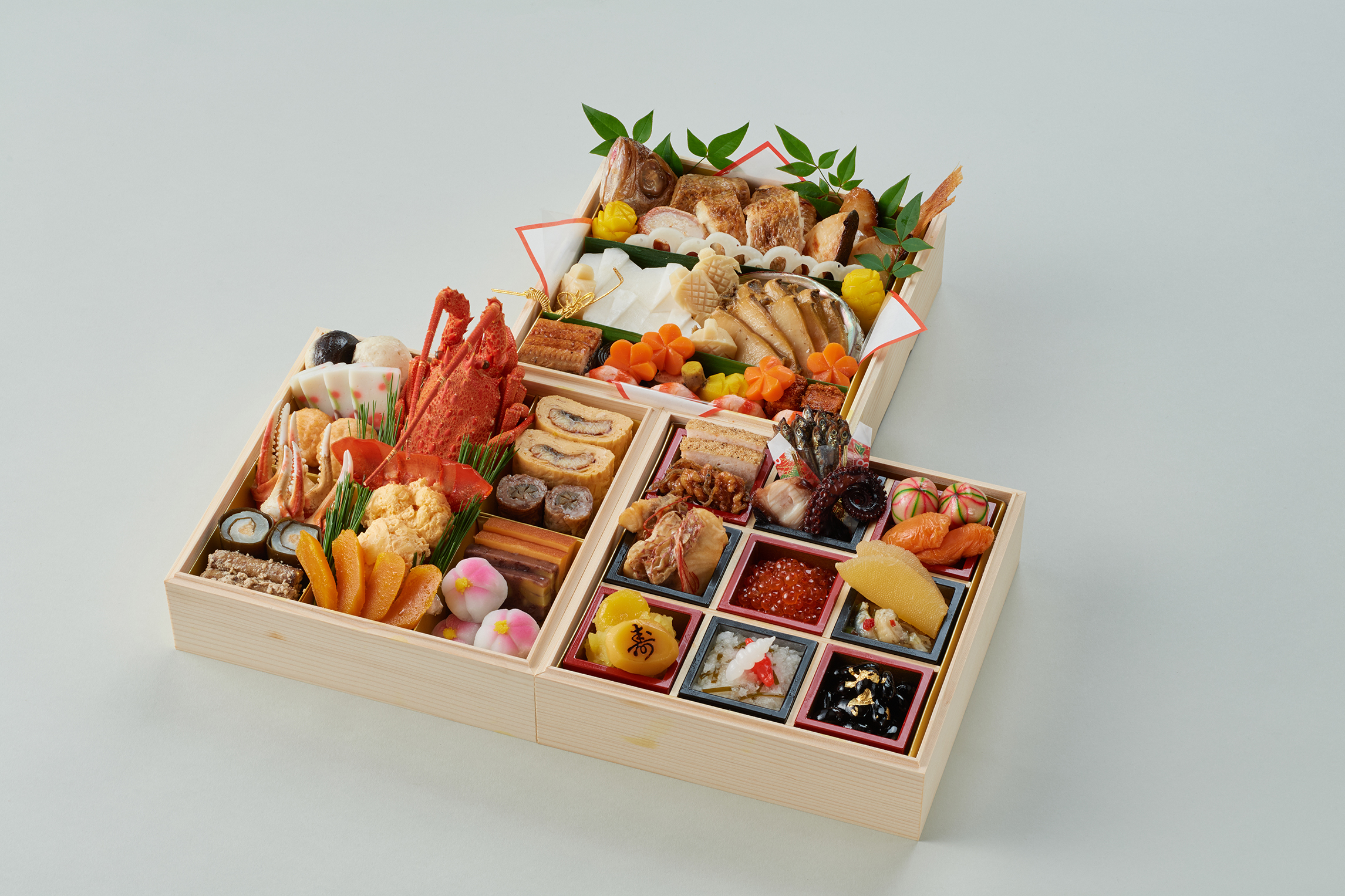 ・ロブスター黄金煮 ・唐墨 ・伊達真丈 ・栗蒸羊羹 ・梅花餅 ・蟹爪生姜酢 ・鮃求肥巻 ・叩き牛蒡 ・鰻巻き玉子 ・豊浦牛八幡巻 ・海老真丈 ・羽子板蒲鉾 ・裏白椎茸