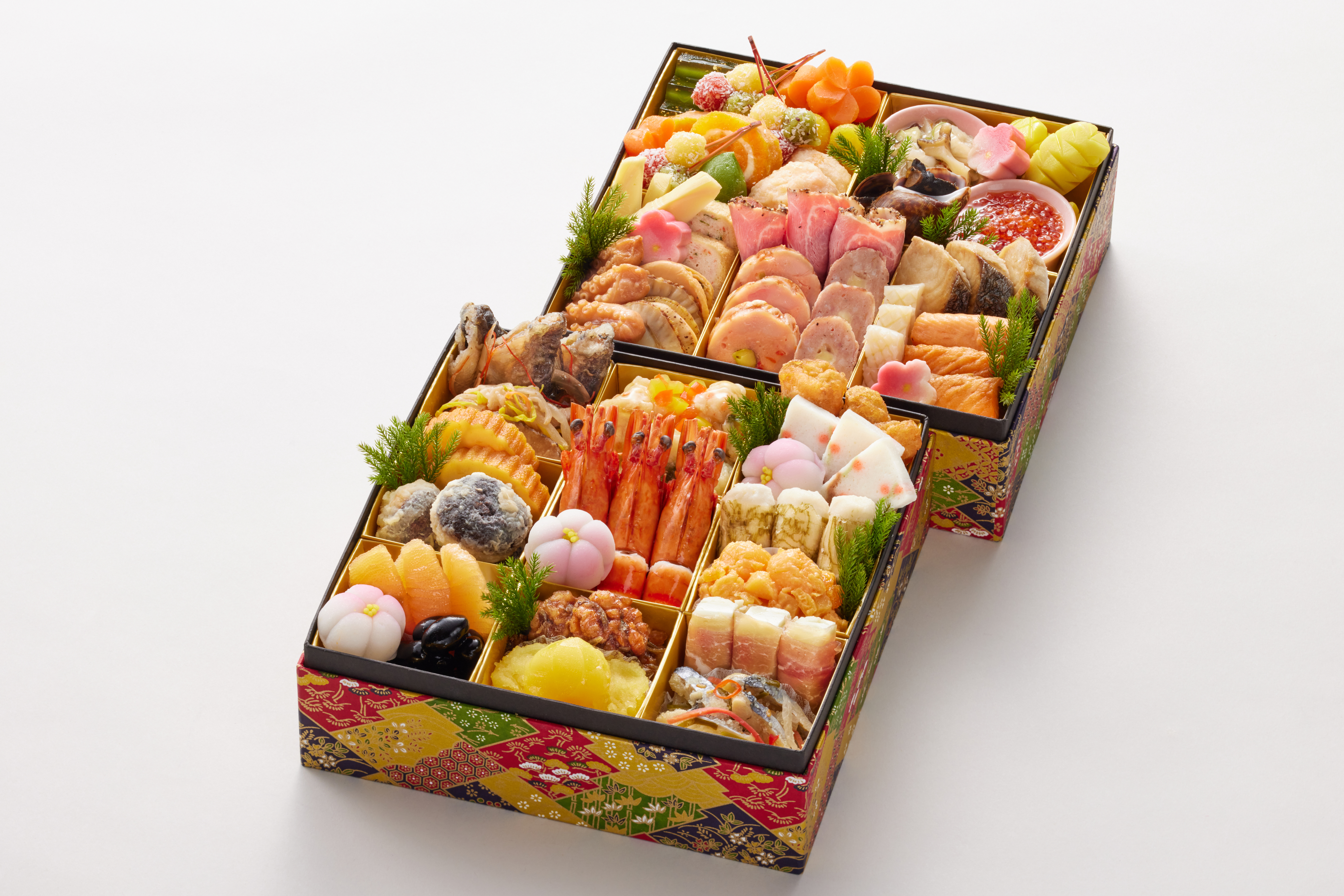 ・チーズ生ハム巻 ・鰊親子膾 ・小女子胡桃 ・栗金団 ・数の子土佐漬 ・黒豆 ・寿小巻湯葉 ・利久丸十 ・海鮮糀和え ・海老酒汐煮 ・伊達巻 ・裏白椎茸 ・鮟鱇唐揚 ・羽子板蒲鉾 ・ちぎり揚げ鼈甲餡 ・ハタハタ南蛮漬 ・かき和え膾 ・梅花餅