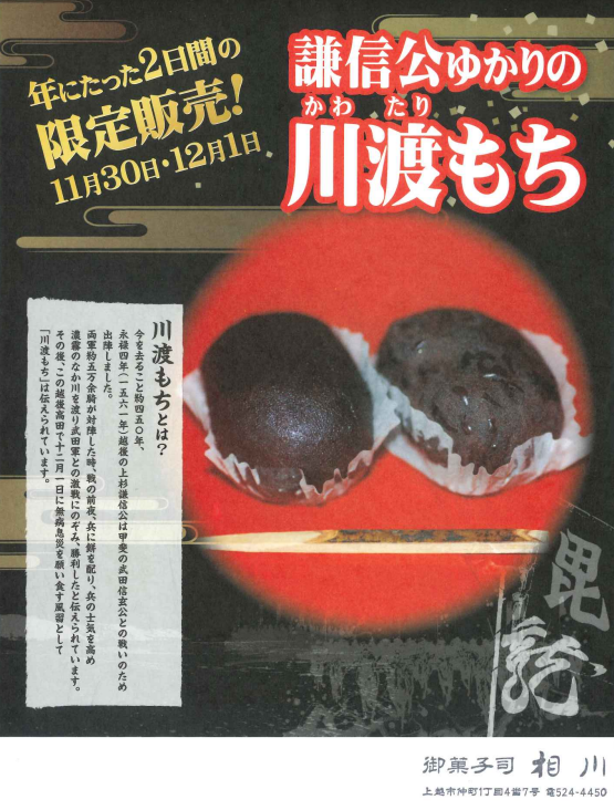 新潟県上越市などで11月30日~12月1日に発売される川中島の戦いにちなんだ和菓子です。川渡もちを食べることで1年間の無病息災を願って食べられる冬の風物詩です!こしあんとつぶあんの2種類です(^^)/