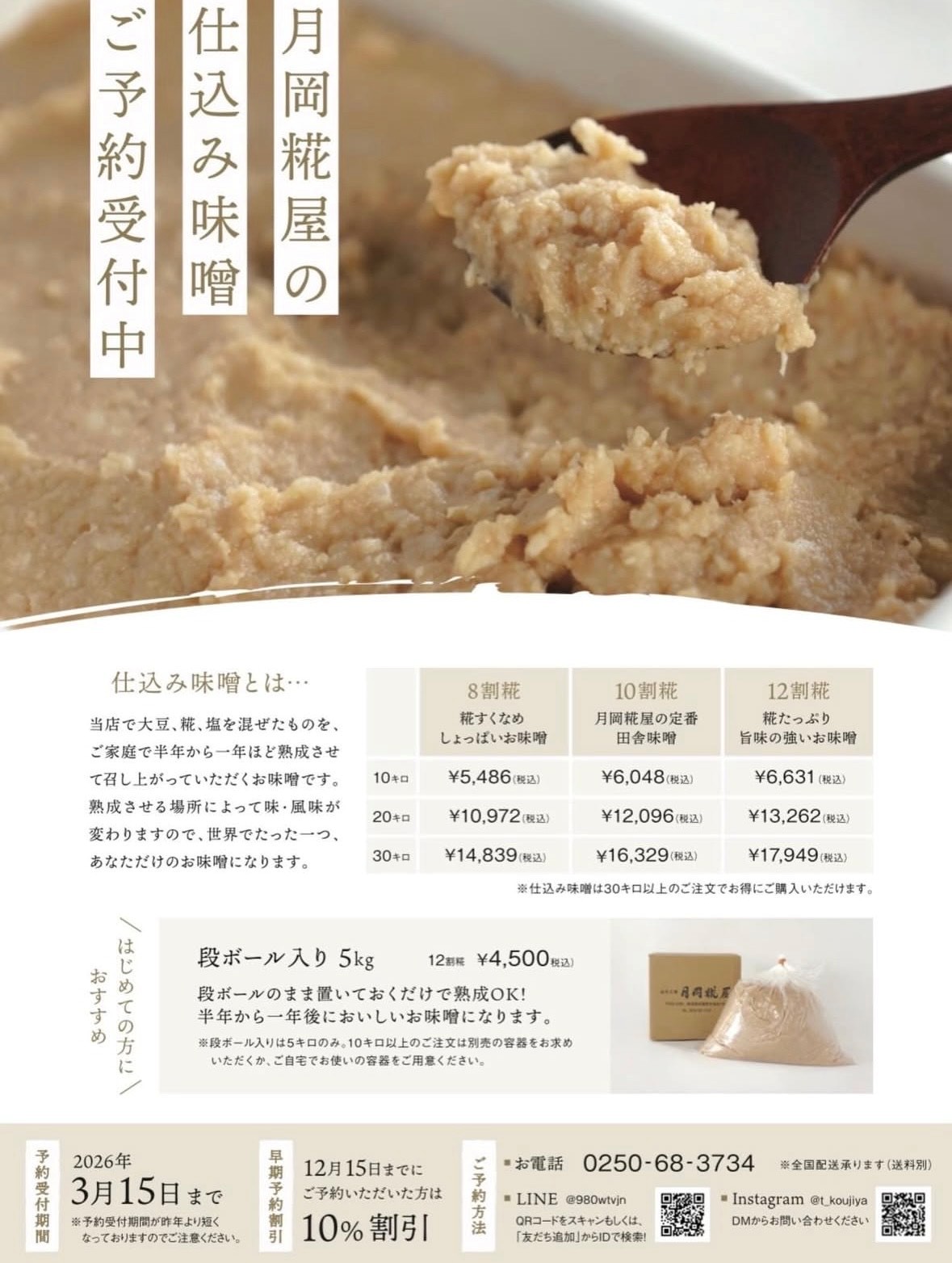 月岡糀屋さんから、”仕込み味噌”ご予約受付中のお知らせです(^^)