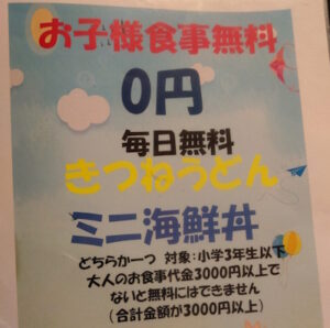 お子様はきつねうどんかミニ海鮮丼どちからを無料でサービス!