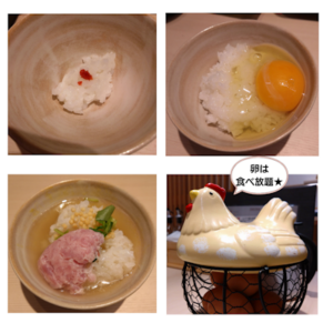 つやつやごはんでお刺身を楽しみ、地鶏卵で卵かけご飯をしたり、パフェに乗っていたねぎとろを乗せて出汁(だし)をかけてお茶漬けにしたり。
