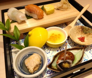 イクラの茶わん蒸し、お寿司、つぶ貝旨煮、玉子焼き、あん肝白醤油!