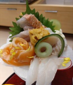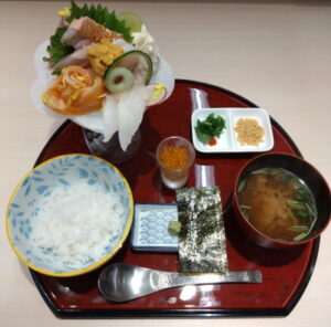 本日の日替わりはオーロラサーモン、平貝、金目鯛、スズキ、生ウニ!大葉の裏にはたっぷりのネギトロとポテトサラダも隠れています。