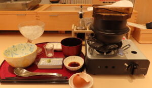 一の膳をつまんでいたらあっという間に6分経過。画像からは伝わってきませんが水分がぶくぶくして見るからにみずみずしい。残りのご飯は再度蓋をして追加で4分蒸らして通常の釜炊きご飯に。