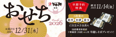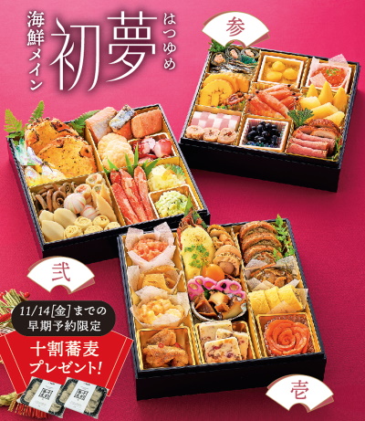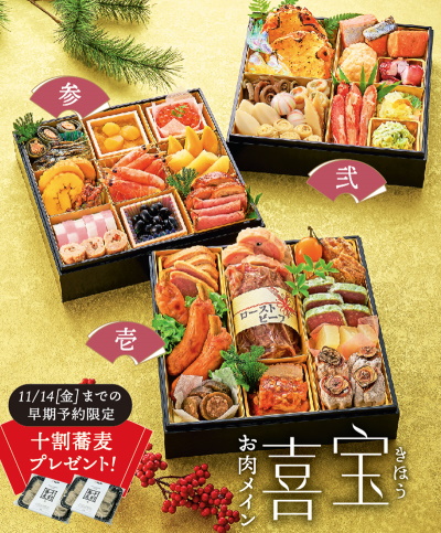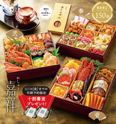 今年は三段重の嘉祥、初夢、喜宝をご注文の皆様に、十割蕎麦(冷凍)4人前をプレゼント!