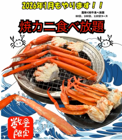 12月に期間限定で実施していた焼カニ食べ放題企画、好評につき、期間を延長して1月も実施中!