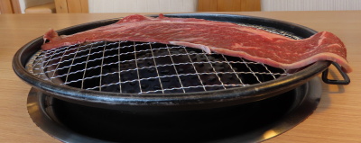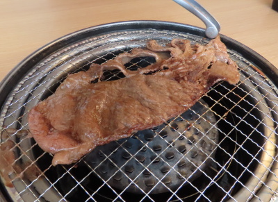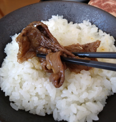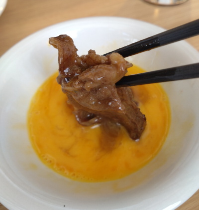 でっっかいすき焼き肉2枚の定食です。これ、お皿に乗り切らなくて肉、折りたたまれてますからね。運ばれてきた瞬間思わず、「うわ、でっか…。」って言ってしまいましたからね。