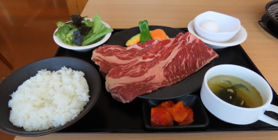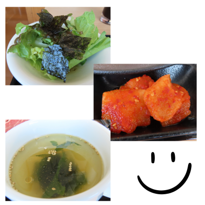イイ…!!お肉はほどよい噛み応えと柔らかさが共存する絶妙な厚み。脂の旨味とタレと卵がマリアージュして口内が幸せ!!韓国海苔が乗ったサラダと大根のキムチ、スープもついて箸休めも盤石!