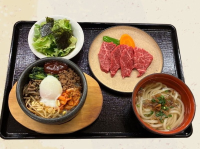黒毛和牛使用の特製石焼ビビンバにミニ温うどん、ハラミ肉、サラダもついた満腹必至の欲張りメニューです。メインしかない!どうかしてる(褒め言葉)!!(今度はこっちを食べにこようそうしよう)