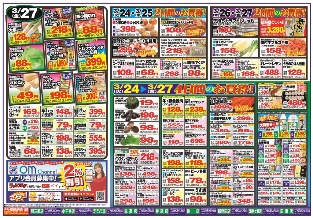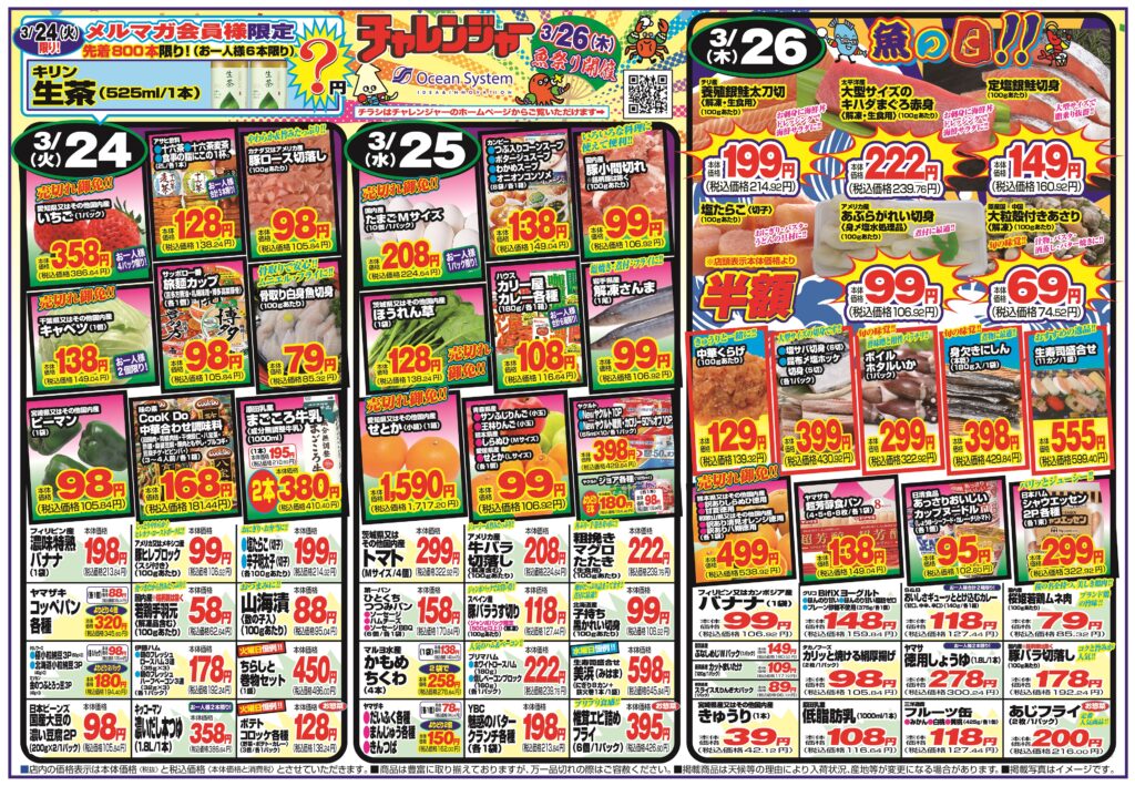チャレンジャーお買い得チラシ3/24号(燕三条店、小千谷店、中央インター店、赤道店、寺尾店、巻店、新発田店、海老ケ瀬店、田家店)
