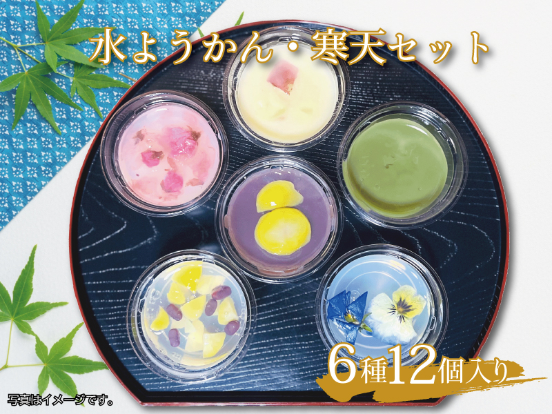 水ようかん(栗ようかん2個、抹茶ようかん2個、芋ようかん2個)と寒天(鹿の子かんてん2個、桜かんてん2個、花かんてん2個)の涼菓12個入セットです。※季節限定:6月~9月