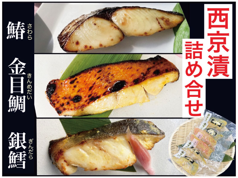 ・当社人気№1の銀だら噌漬、脂のある金目鯛西京漬とトラウト本造り,いい塩加減の新巻鮭,さわら西京漬の5種類の魚の味が楽しめる、盛沢山のセットです。味噌を拭き取って、フライパンかグリルで加熱して焼きたてをお召し上がりください。