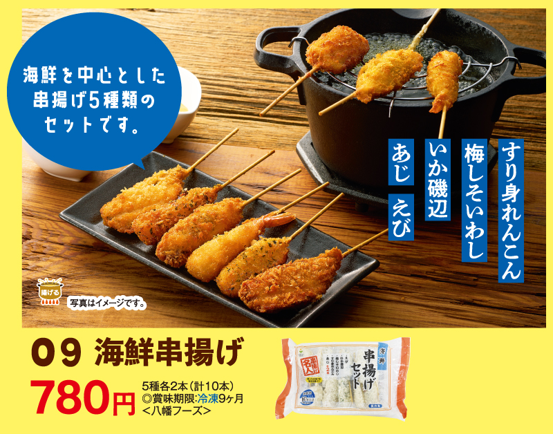 あじ串・えび串・いか磯部・梅しそいわし串・すり身れんこん