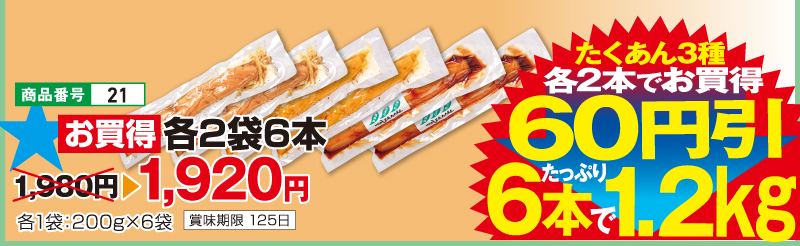 【お買得】 国産大根の三色たくあん 各2袋 6本