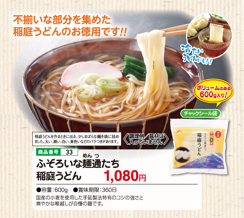 ●容量:600g ●賞味期限:360日 ※具材は入っておりません。 ※稲庭うどんを作るときに出る、少しまばらな麺を袋に詰めました。太い、細い、白い、黄色いなどのバラつきがあります。 ===================== 【注文締切日 12月22日(月)】 =====================