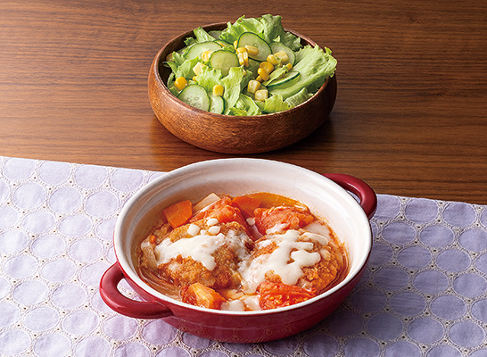 【418】カットミール3人用 1/22(木)スープの素で簡単♪チーズトマトひれかつ煮(成型肉)