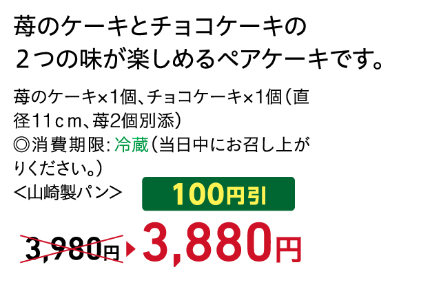 苺のケーキ×1個、チョコケーキ×1個 (直径11cm、苺2個別添)