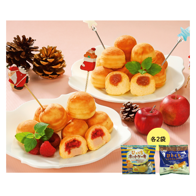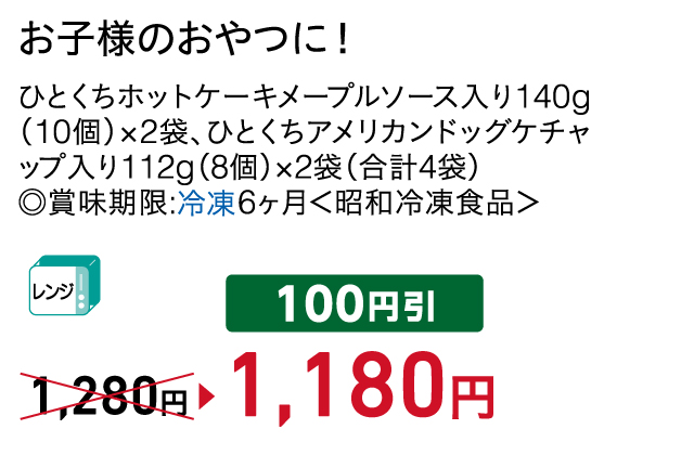 ひとくちホットケーキメープルソース入り140g(10個)×2袋、ひとくちアメリカンドッグケチャップ入り112g(8個)×2袋(合計4袋) ◎賞味期限:冷凍6ヶ月