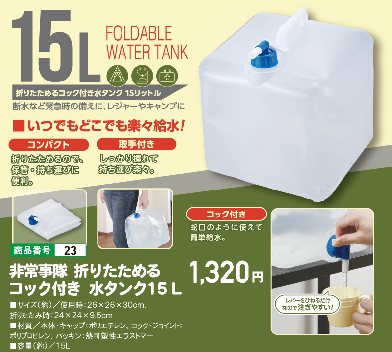 ■サイズ(約)/ 使用時: 26×26×30cm、折りたたみ時: 24×24×9.5cm ■材質/本体・キャップ:ポリエチレン、コック・ジョイント:ポリプロピレン、パッキン: 熱可塑性エラストマー ■容量(約)/15L