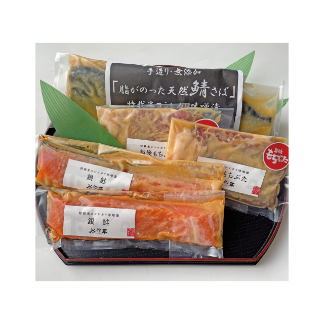 特栽コシヒカリ味噌漬 銀鮭・越後もちぶた・天然さばの三種詰め合わせ【株式会社 谷平】