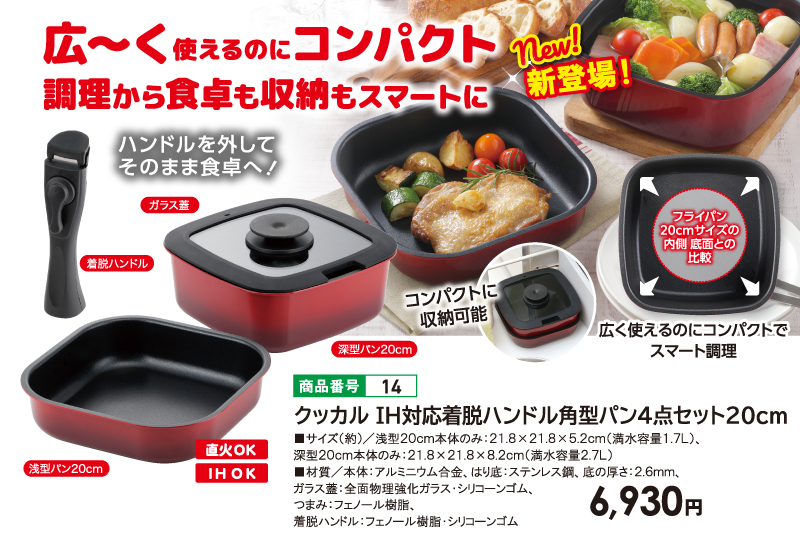 ■サイズ(約)/浅型20cm本体のみ:21.8×21.8×5.2cm (満水容量1.7L)、 深型20cm本体のみ:21.8×21.8×8.2cm (満水容量2.7L) ■材質/本体:アルミニウム合金 はり底:ステンレス鋼、 底の厚さ:2.6mm、ガラス蓋: 全面物理強化ガラス・シリコーンゴム、 つまみ:フェノール樹脂、着脱ハンドル:フェノール樹脂・シリコーンゴム ※直火、IH対応 【セット内容】 ・深型パン20㎝ ・浅型パン20㎝ ・ガラス蓋 ・着脱ハンドル